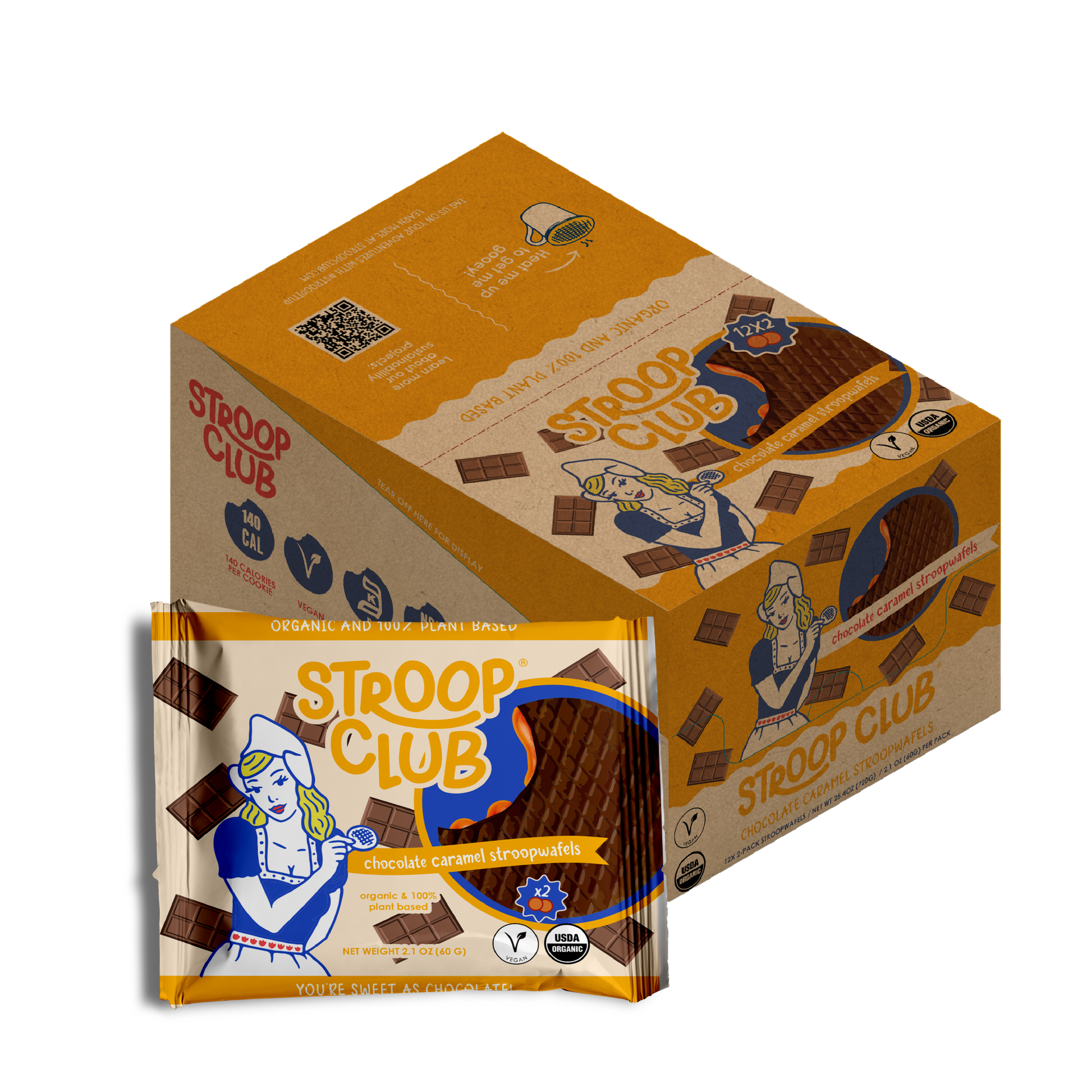 Stroop Club Chocolate Caramel Plant Based and Organic Stroopwafels Box - 12 packs x 2-pack case create chocolate notes in Stroop Club’s authentic Dutch Stroopwafel, we added organic, Fair Trade pure Dutch cacao powder to the dough and syrup. Less sweet & incredibly delicious! All organic and vegan.
