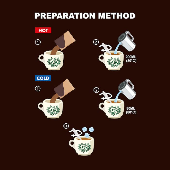 - Empty the 30g sachet contents into cup. Add roughly 200 ml (7.0 fl. oz) Hot water and stir well.