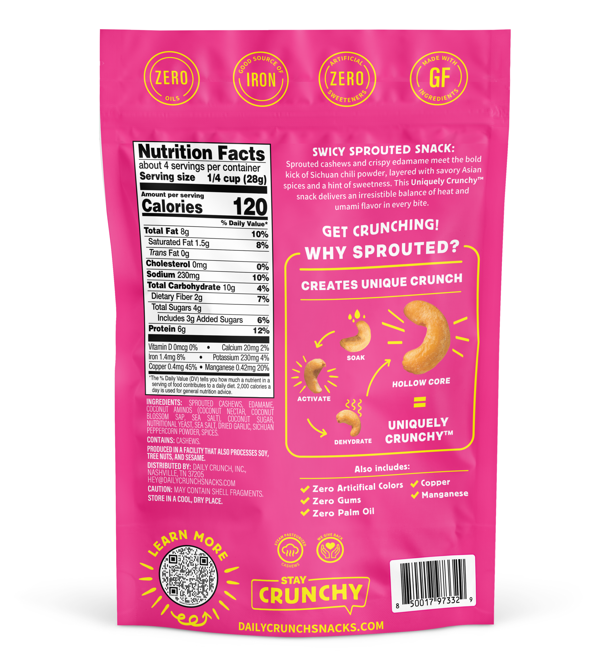 SWICY SPROUTED SNACK: Sprouted cashews and crispy edamame meet the bold kick of Sichuan chili powder, layered with savory Asian spices and a hint of sweetness. This Uniquely Crunchy™ snack delivers an irresistible balance of heat and umami flavor in every bite. Get Crunching!