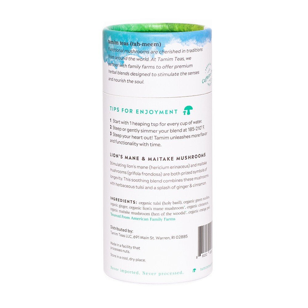 organic tulsi (holy basil), organic green rooibos, organic ginger, organic lion's mane mushroom*, organic cinnamon, organic maitake mushroom (hen of the woods)*, organic orange peel.
