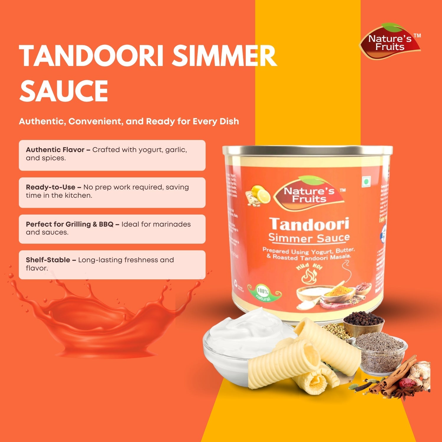 Nature’s Fruits Tandoori Simmer Sauce is inspired by classic Indian tandoor flavors, offering a smoky, mildly spiced, and aromatic taste profile. Made with tomatoes, yogurt-style spices, and traditional herbs, this sauce is perfect for creating flavorful tandoori-style dishes without the need for a clay oven. Simply simmer with vegetables, paneer, tofu, or protein of your choice for a rich and satisfying meal. Carefully prepared using quality ingredients, Nature’s Fruits ensures authentic taste and consistent results every time.