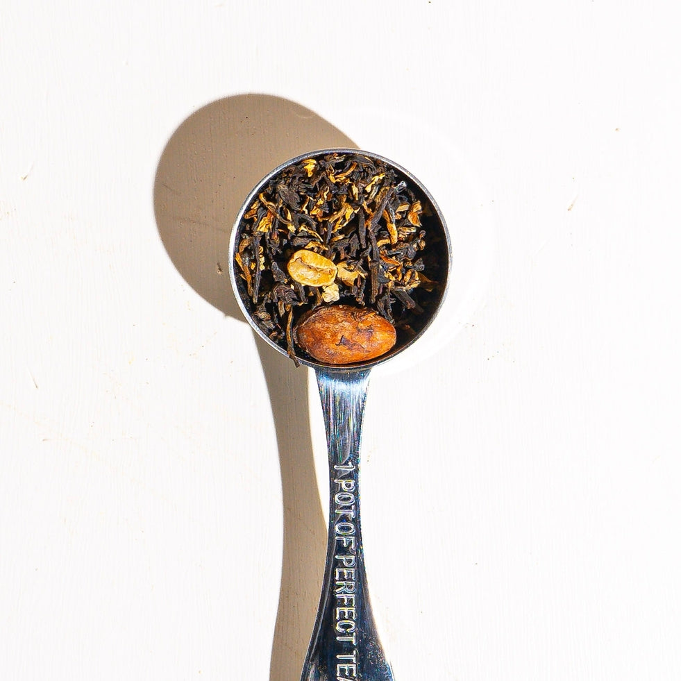 Delicious toffee notes from aged pu-erh balanced with Ethiopian coffee and Kerala cocoa. Superb after dinner.