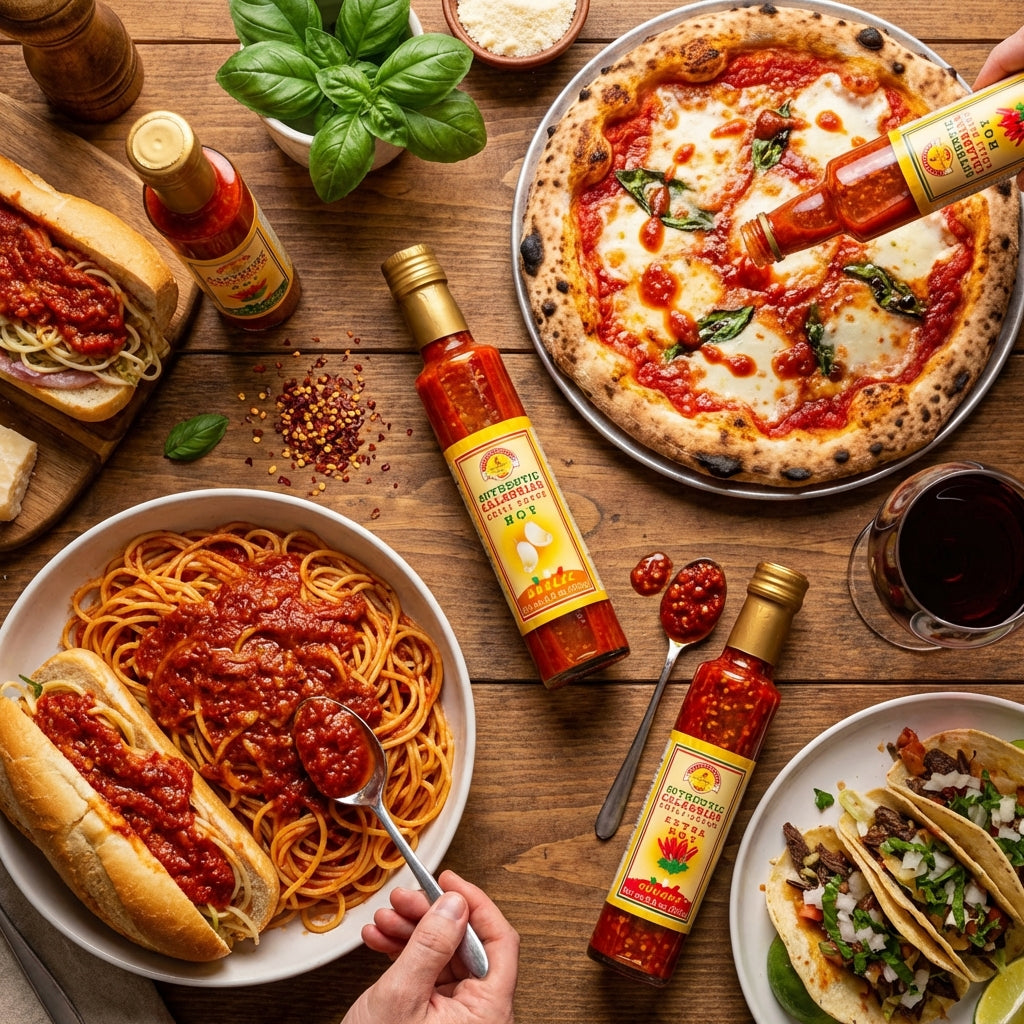 Made with simple, all-natural ingredients – Calabrian peppers, garlic, water, vinegar, olive oil, and salt – this versatile sauce enhances everything from pizza and pasta to chicken wings, grilled vegetables, soups, and even cocktails like Bloody Marys.