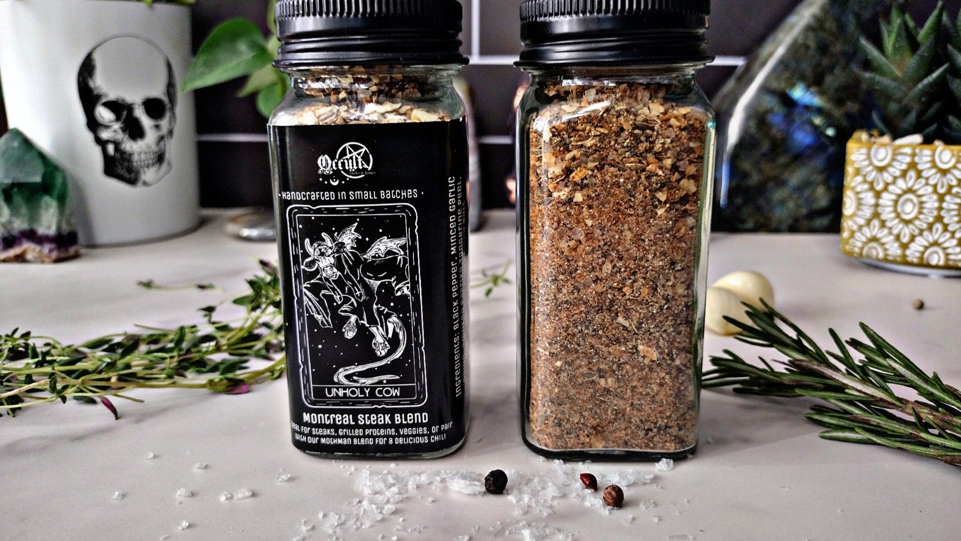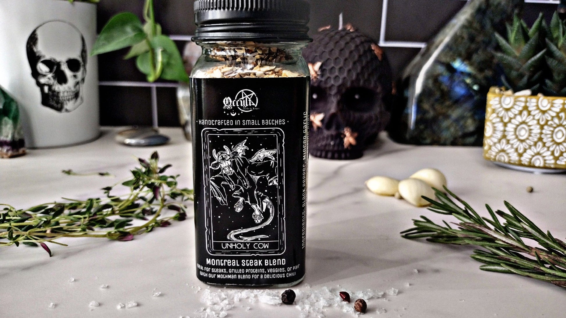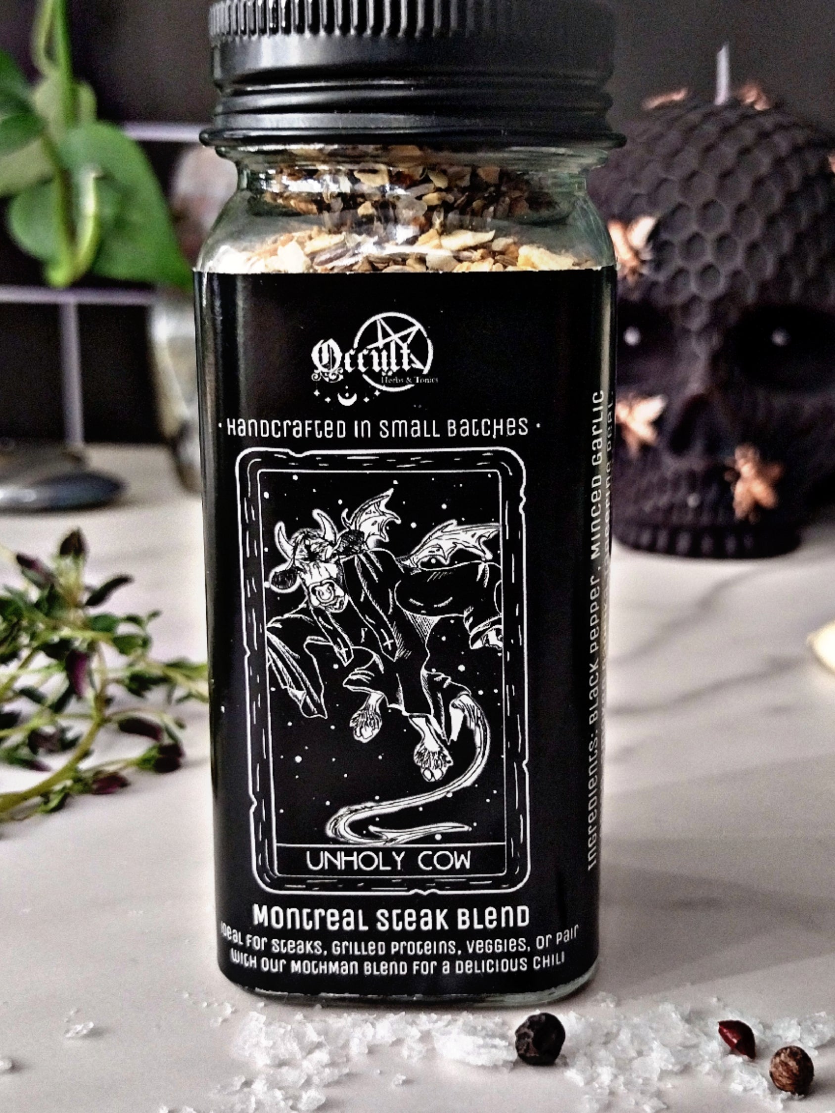 Summoned from the depths of the underworld, Unholy Cow is our wicked twist on the classic Montreal steak blend. With bold garlic, earthy dill seed, and a flash of bright tangerine peel, this seasoning strikes a perfect balance of savory, citrus, and spice — powerful enough to raise the flavor of any cut of meat.