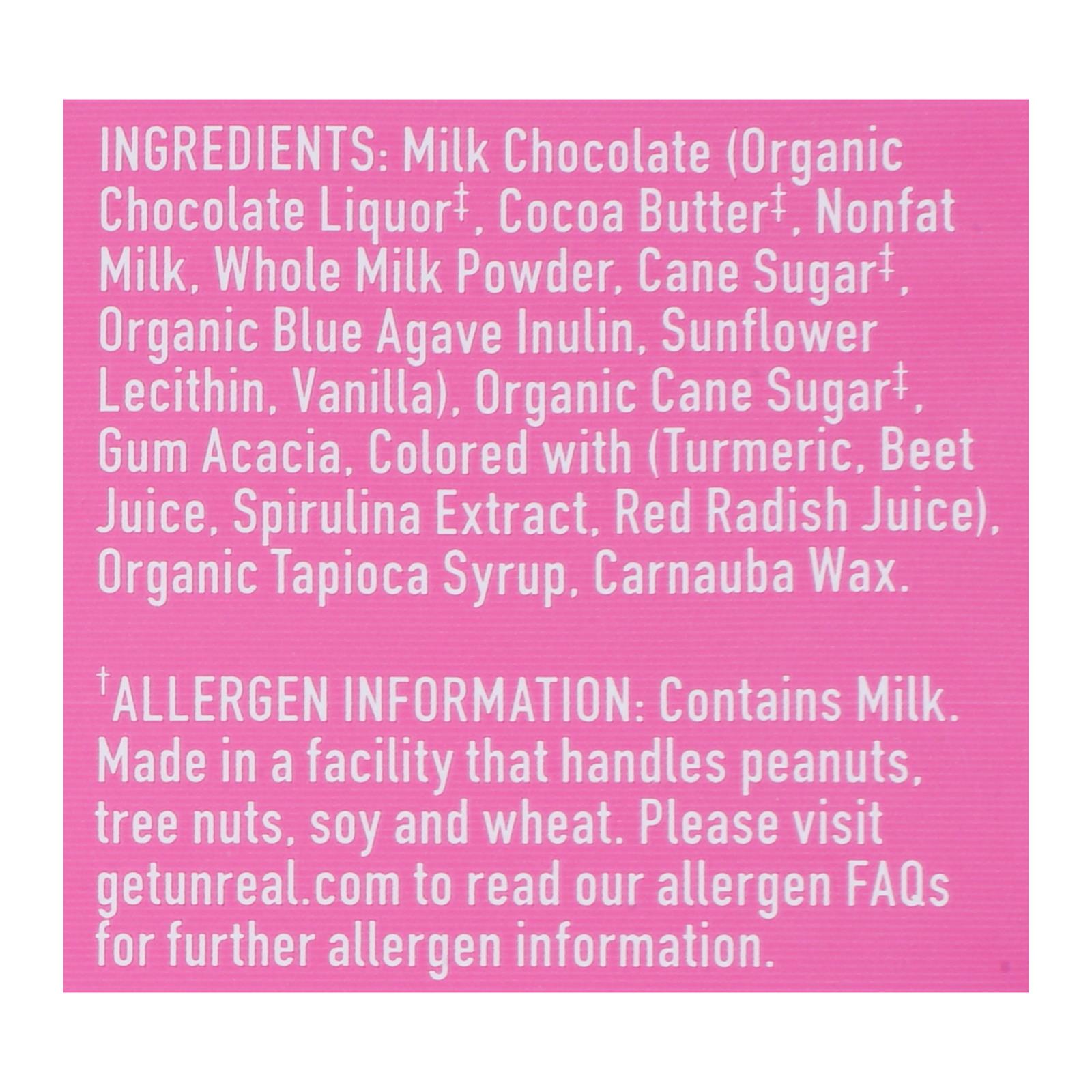 ITS NAME MAY BE UNREAL, BUT THERE'S NOTHING ARTIFICIAL ABOUT WHAT GOES INTO THESE DELICIOUS CANDY COATED MILK CHOCOLATE GEMS. CREAMY MILK CHOCOLATE CENTER WITH A CRUNCHY SHELL THAT’S NATURALLY COLORED BY VEGETABLES, THESE GEMS ARE HARD TO PUT DOWN. MADE WITH FAIR-TRADE CHOCOLATE AND ORGANIC, SOY-FREE INGREDIENTS. INCLUDES ONE 6 OZ. BAG OF CANDY COATED MILK CHOCOLATE GEMS. SEE NUTRITION FACT PANEL FOR ALLERGENS. OF COURSE SNACKS SHOULD BE FUN, BUT WHAT ABOUT CHANGING THE WORLD? WE THINK THAT THAT SHOULD BE FUN TOO. FINDING JUST THE RIGHT CABBAGES, BEETS AND CARROTS FOR OUR COLORS, PAYING FARMERS FAIRLY, SOURCING NON-GMO, SUSTAINABLE INGREDIENTS: ALL HAPPY DAYS. THE ONLY THING WE'RE MORE SERIOUS ABOUT THAN FUN? THE TASTE.