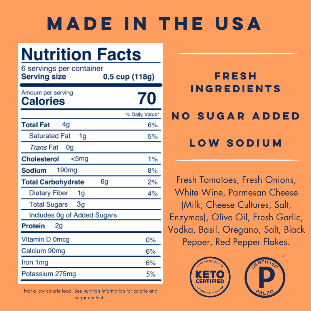 Enhance any meal with Yo Mama’s bright and creamy Vodka Tomato Sauce. Let each bite serenade your senses with a tantalizing blend of sweet and vibrant flavors, with a hint of warmth to round out the flavor profile. Dive into a jar and let the passion of flavors sweep you off your feet.