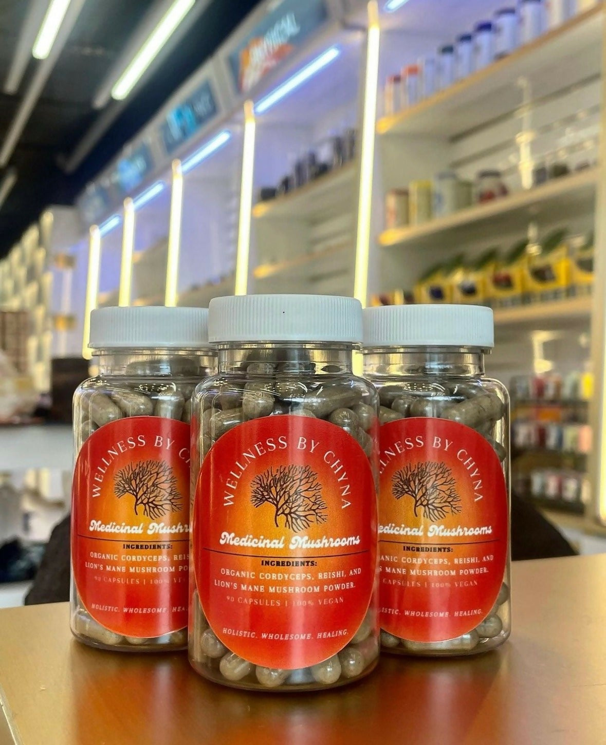 Wellness by Chyna Medicinal Mushroom Capsules Jar - 12 Jars x 90 Capsules case omes with 90 capsules per Jar, made with reishi, lion’s mane, and cordyceps. Overall great for immunity, brain function, inflammation, and athletic performance.