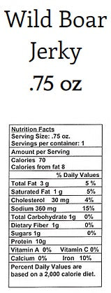 Ingredients: wild boar, beef, salt, spices, brown sugar, onion powder, garlic powder, molasses, paprika, celery powder.
