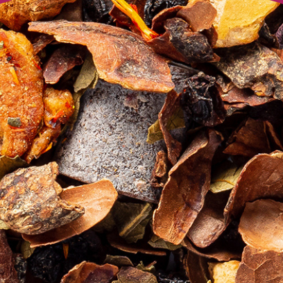 Apple pieces, cocoa shell, hibiscus, sweet blackberry leaves, elderberries, chocolate chunks (sugar, cocoa, soy), natural flavors, safflowers, cherries.