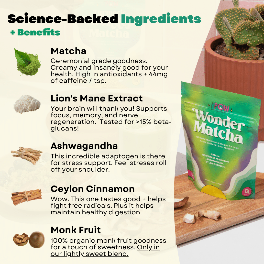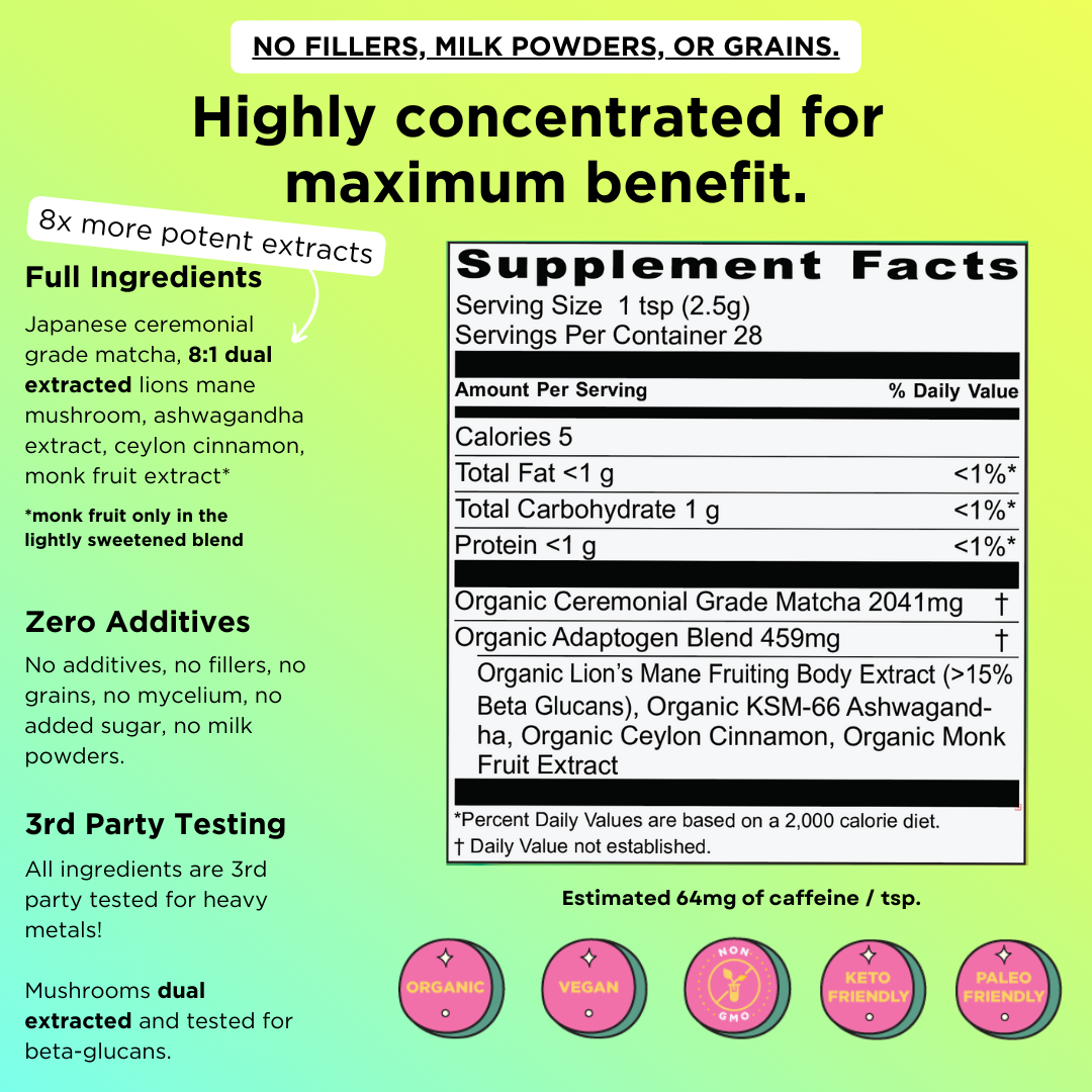 This insanely tasty blend of organic ceremonial grade matcha (from Uji Japan), functional mushrooms, and adaptogens is formulated to rejuvenate your body and mind. Matcha for serene energy and incredible health benefits, functional mushroom extracts to increase your focus and productivity, and adaptogens to help you manage stress and anxiety.