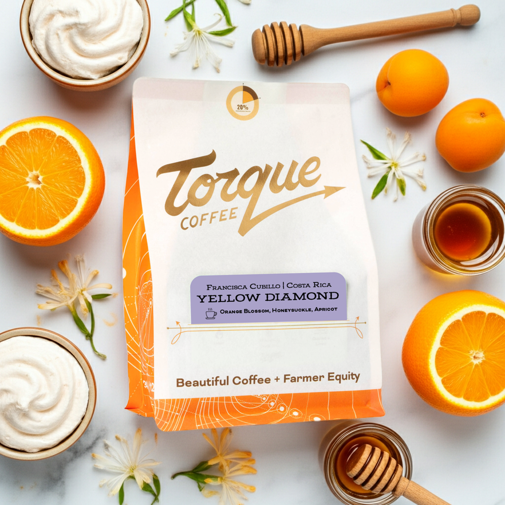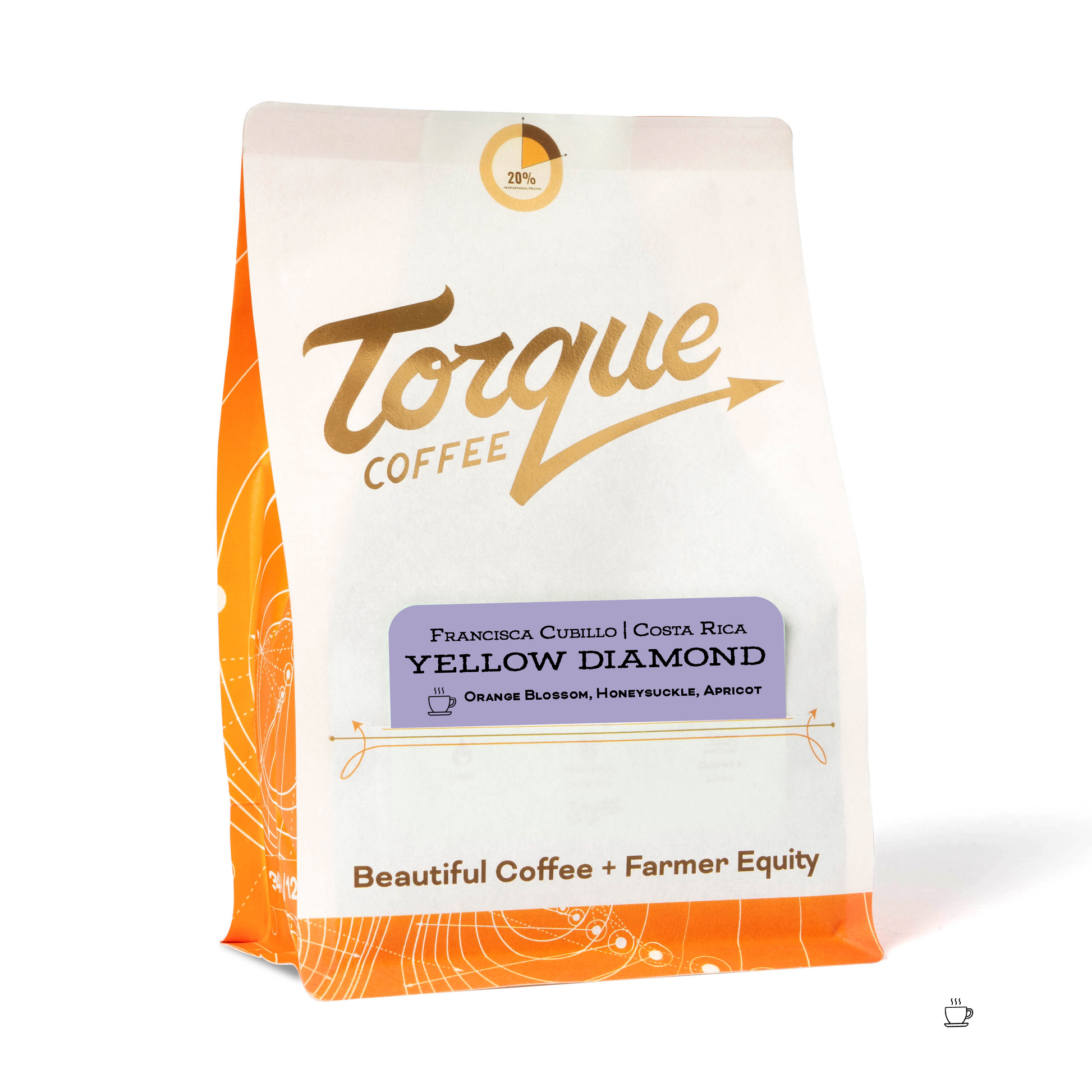 The Yellow Diamond process removes all but 25% of the mucilage (honey) from the coffee for a delicate honey touch. The extended drying process utilizes 50% raised bed, 50% patio dried, turned constantly to ensure even drying.