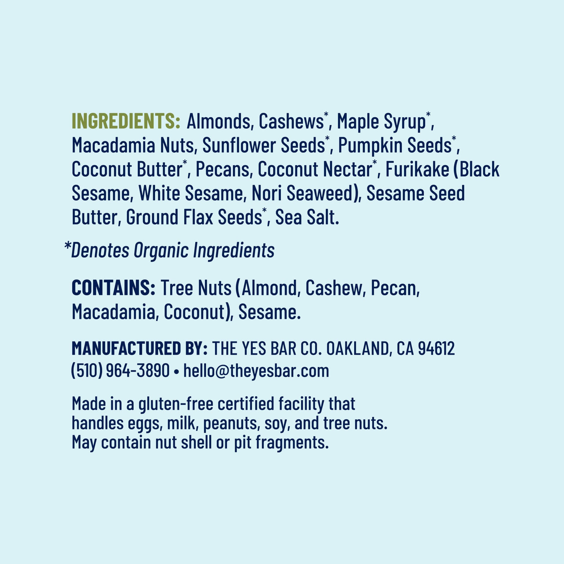 CONTAINS: Tree Nuts (Almond, Cashew, Pecan, Macadamia and Coconut), and Sesame.