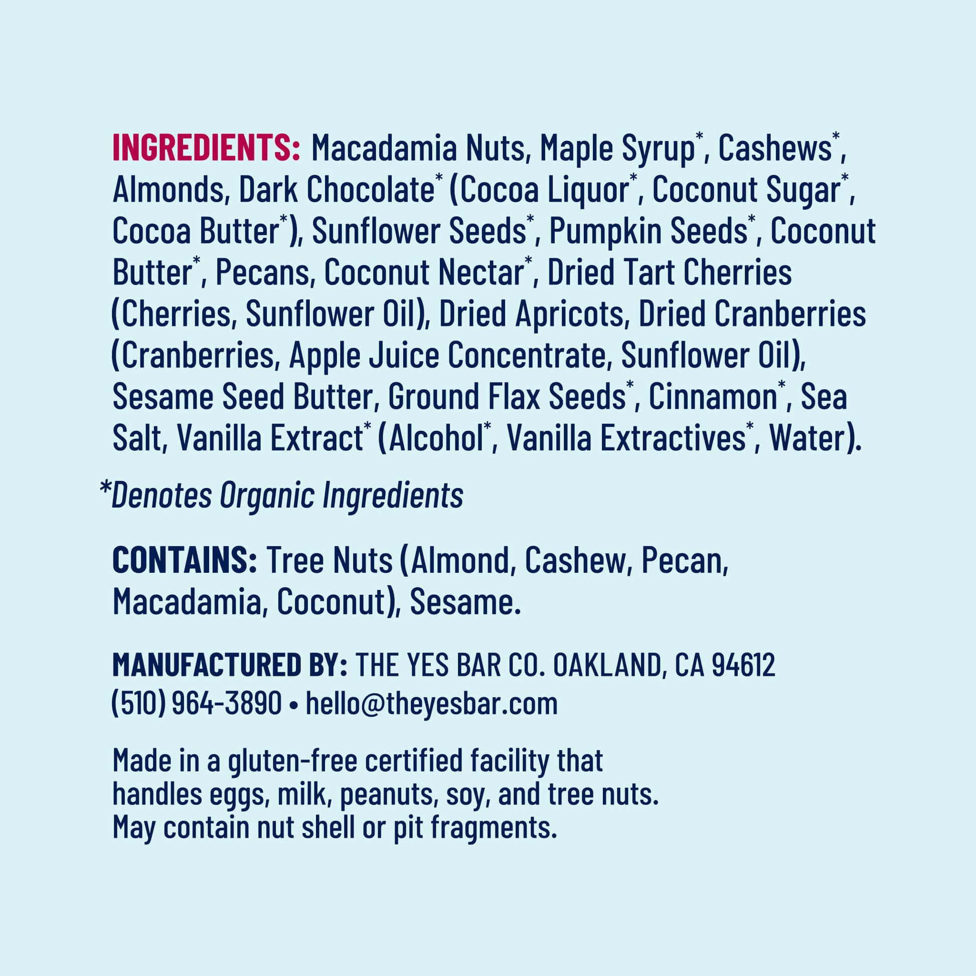 INGREDIENTS: Macadamia Nuts, Maple Syrup*, Cashews*, Almonds, Dark Chocolate* (Organic Cocoa Liquor, Organic Coconut Sugar, Organic Cocoa Butter), Sunflower Seeds*, Pumpkin Seeds*, Coconut Butter*, Pecans, Coconut Nectar*, Dried Tart Cherries (Cherries, Sunflower Oil), Dried Apricots, Dried Cranberries (Cranberries, Apple Juice Concentrate, Sunflower Oil), Sesame Seed Butter, Ground Flax Seeds*, Cinnamon*, Sea Salt, Vanilla Extract* (Organic Alcohol, Organic Vanilla Extractives, Water). *Organic.