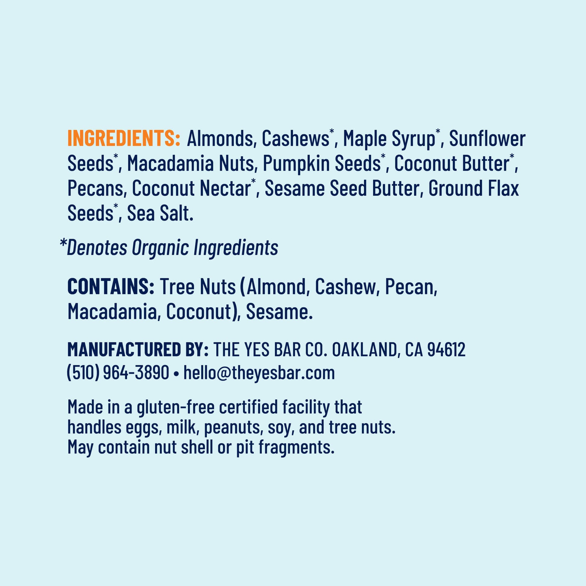 YES Bars tried-and-true blend of delicious pecans, macadamias, almonds and cashews with a kiss of Grade B Vermont Maple Syrup and delectable French sea salt. YES BAR® Salted Maple Pecan Pack is crunchy, chewy, nutty, plant-based goodness. Perfect as an afternoon indulgence, or to start off your day with a cup of coffee.
